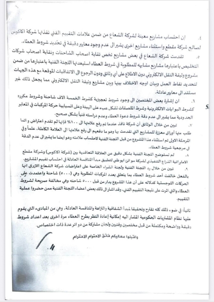 واشار في مداخلته ان الملف التحقيقي الذي اجرته هيئة مكافحة الفساد قد خلُص إلى أن العطاء قد شابه عدم الدقة و الاختلال في تطبيق معايير النزاهة و الشفافية و مخالفة المواد (38.17.7) من نظام المشتريات الحكومية رقم (😎 لسنة (2022) - الأمر الذي يخل بمبدأ المنافسة العادلة بين المتناقصين.