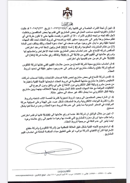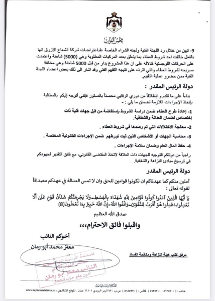 بالوثائق - أبو رمان يطالب الحكومة بمداخلته تحت القبة بالإمتثال إلى قرار لجنة التحقيق الصادرة عن هيئة مكافحة الفساد بخصوص عطاء هيئة النقل رقم 1/24 #عاجل