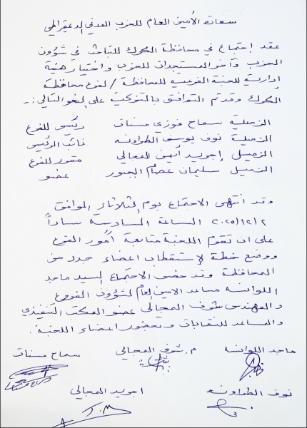 وقد تم اختيار السيدة سماح مسنات رئيساً للفرع، والسيدة نوف الطراونة نائباً للرئيس، والسيد جريد المجالي مقرراً للحزب، بالإضافة إلى السيد سليمان المجالي عضواً في الهيئة الإدارية.