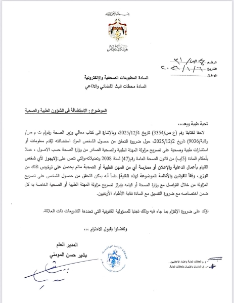 واختتم د. الطراونة تصريحه بدعوة جميع الزملاء الأطباء والمؤسسات الإعلامية إلى الالتزام التام بهذه التعليمات، وتغليب المصلحة الوطنية والصحية العليا، مؤكداً أن "الوعي الصحي يبدأ بكلمة صادقة ومسؤولة تصدر عن مختص مرخص".