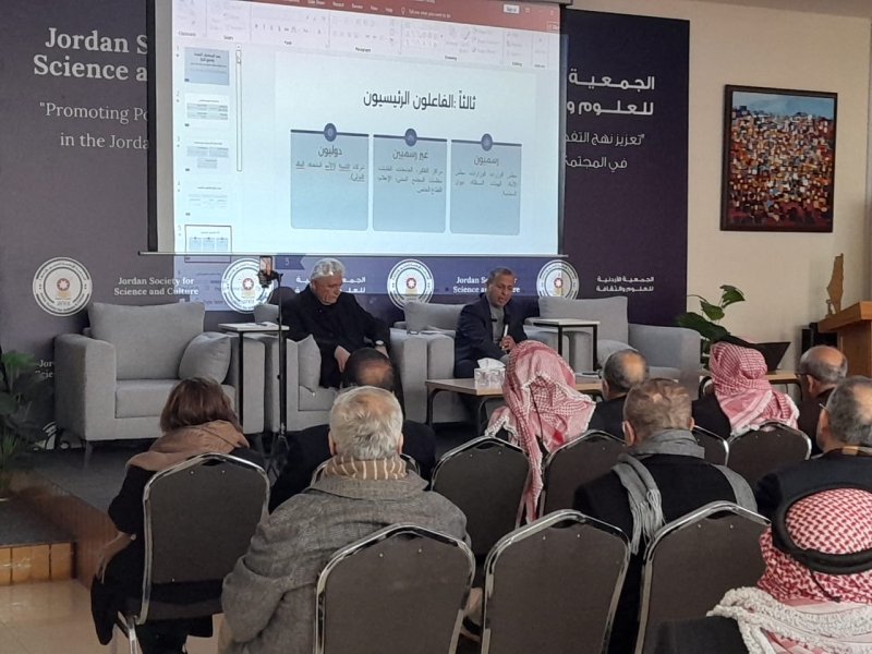 بحضور رئيسها الوزير الاسبق سمير الحباشنة وأعضائها ومجموعة من المهتمين عقدت الجمعية الأردنية للعلوم والثقافة ظهر السبت الفائت ندوة بعنوان " رسم السياسات العامة وصنع القرار "حاضر فيها اللواء المتقاعد المهندس بسام الفالح وقدمه العميد المتقاعد ايمن الروسان عضو الجمعية .