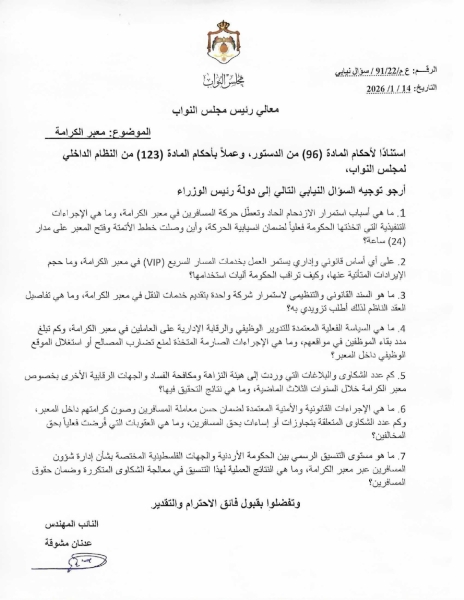 وختم النائب سؤاله بالاستفسار عن مستوى التنسيق الرسمي بين الحكومة الأردنية والجهات الفلسطينية المختصة في إدارة شؤون المسافرين عبر معبر الكرامة، والنتائج العملية لهذا التنسيق في معالجة الشكاوى وضمان حقوق المسافرين.