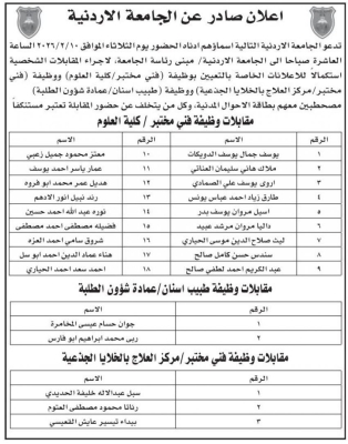 كما اعلنت مؤسسة التدريب المهني عن حاجتها لتعبئة وظائف شاغرة، فيما أعلنت الجامعة الأردنية عن اسماء مدعوين لاجراء المقابلات الشخصية لغايات التعيين.