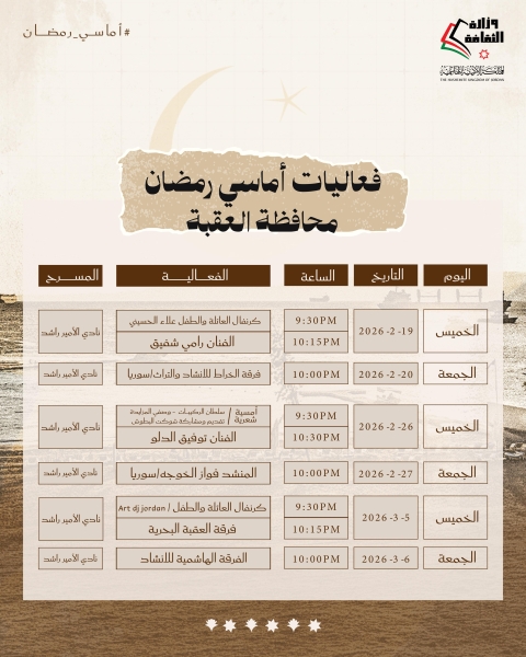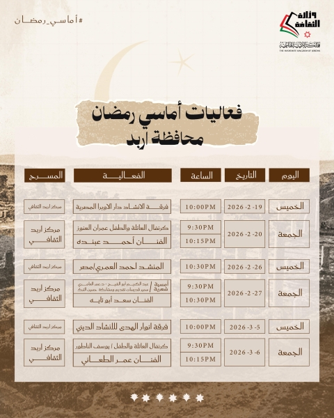 وقال وزير الثقافة مصطفى الرواشدة، إنّ البرنامج غنيّ بالفعاليات التي تراعي التنوّع وبثّ القيم الإيجابية خلال أيام الشهر الفضيل، لافتًا إلى مشاركة عدد من فرق الإنشاد الديني، والمنشدين الأردنيين والعرب.
