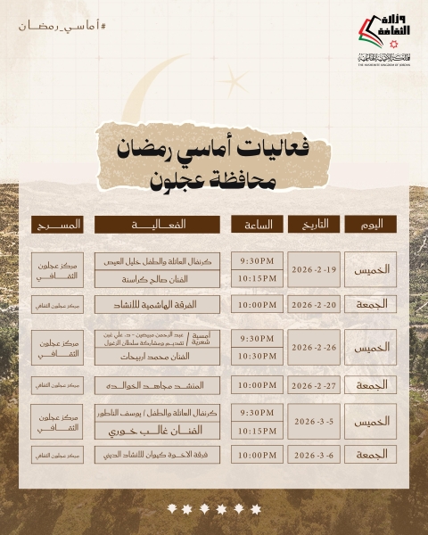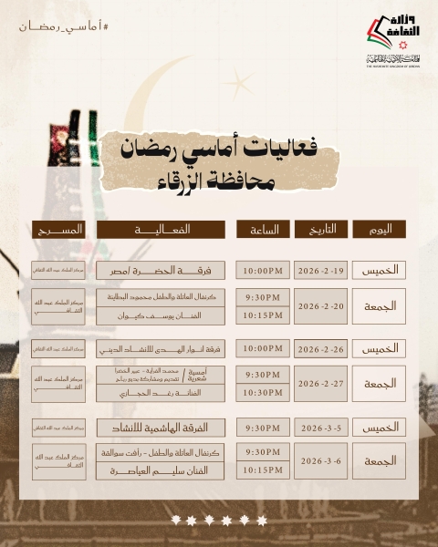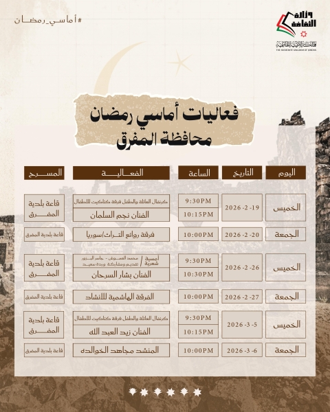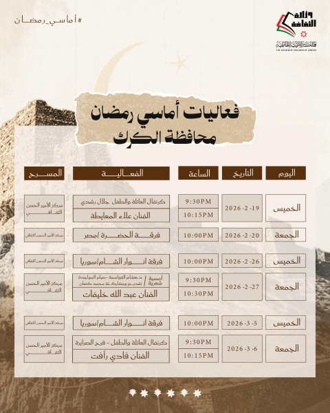 يشار إلى أنّ الأمسيات الرمضانية تقام في المراكز الثقافية في كافة محافظات المملكة، يوميّ الخميس والجمعة من كل أسبوع خلال شهر رمضان، من الساعة التاسعة والنصف مساءً حتى الثانية عشرة ليلاً، والدعوة عامة .