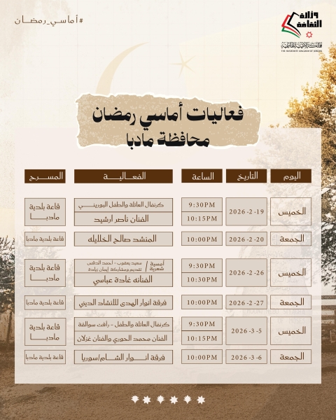 أعلنت وزارة الثقافة عن برنامج "أماسي رمضان"، والذي يتضمن فعاليات عديدة، جاءت انسجامًا مع ما يحمله الشهر الفضيل من قيم روحية واجتماعيّة، ولما للجانب الثقافي من حضور في هذا المجال.