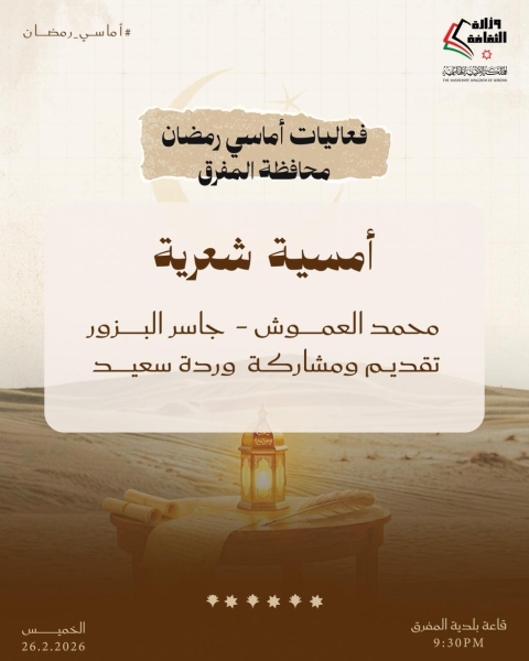 ويأتي البرنامج ضمن توجه الوزارة إلى توزيع الفعاليات الثقافية على مختلف المحافظات، بما يتيح للجمهور المشاركة في أنشطة رمضانية تعزز حضور الثقافة في الحياة العامة.