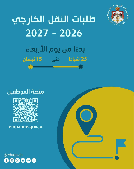 دعت وزارة التربية والتعليم الزميلات والزملاء الراغبين بالنقل الخارجي إلى مديريات أخرى للعام الدراسي 2026/2027، إلى تعبئة نموذج طلب النقل الخارجي إلكترونيًا من خلال رابط منصة الموظفين/حساب الموظف الشخصي.