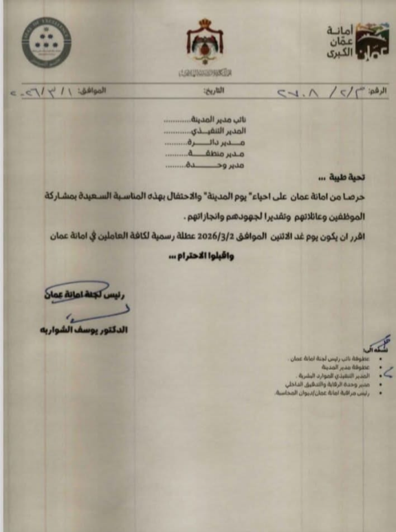 عطلة لموظفي أمانة عمان غدا الاثنين بمناسبة يوم المدينة _وثيقة