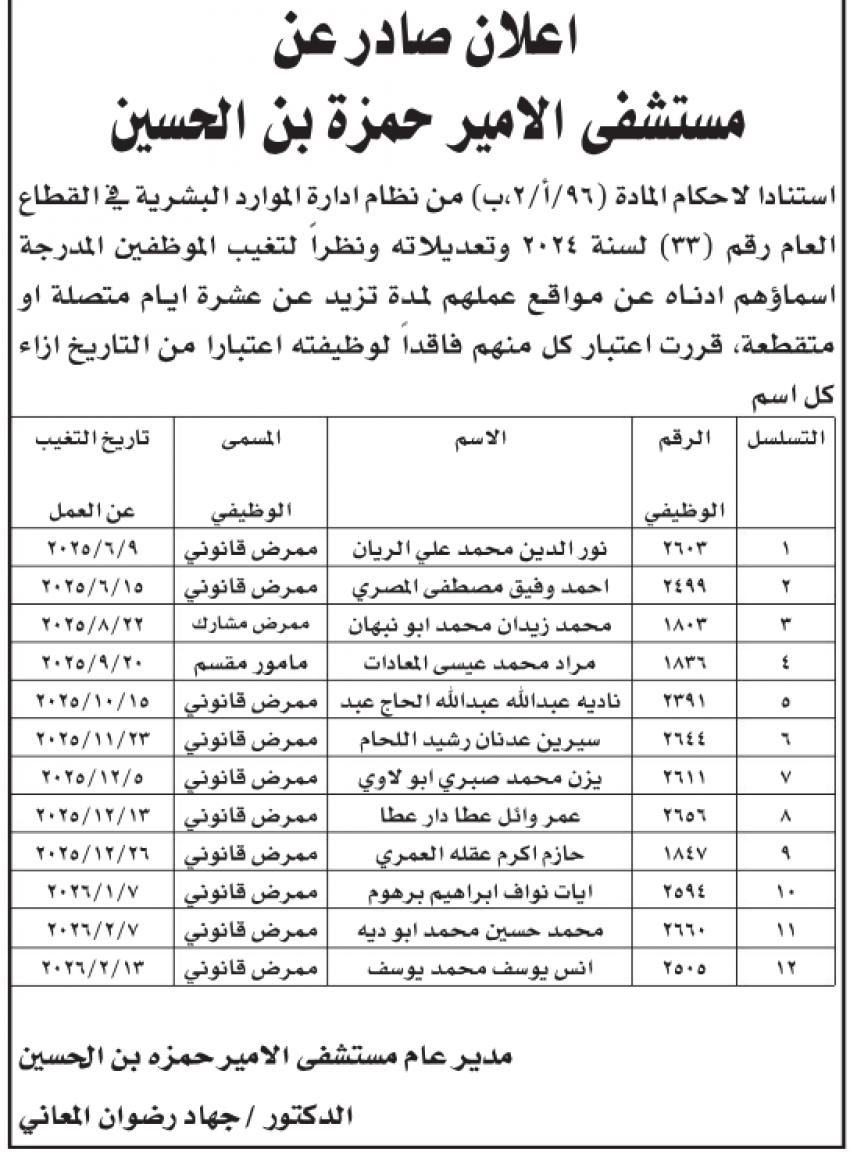 أعلنت وزارة الصحة عن أسماء عدد من الموظفين فقدوا وظائفهم لتغيبهم عن العمل بدون سبب أو عذر.