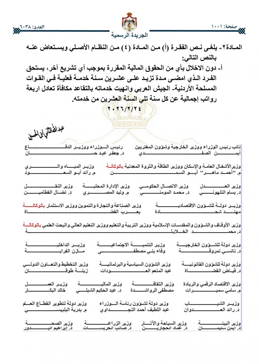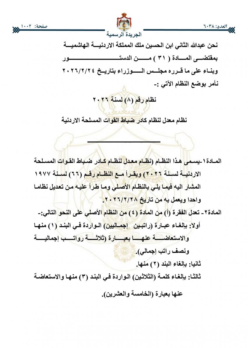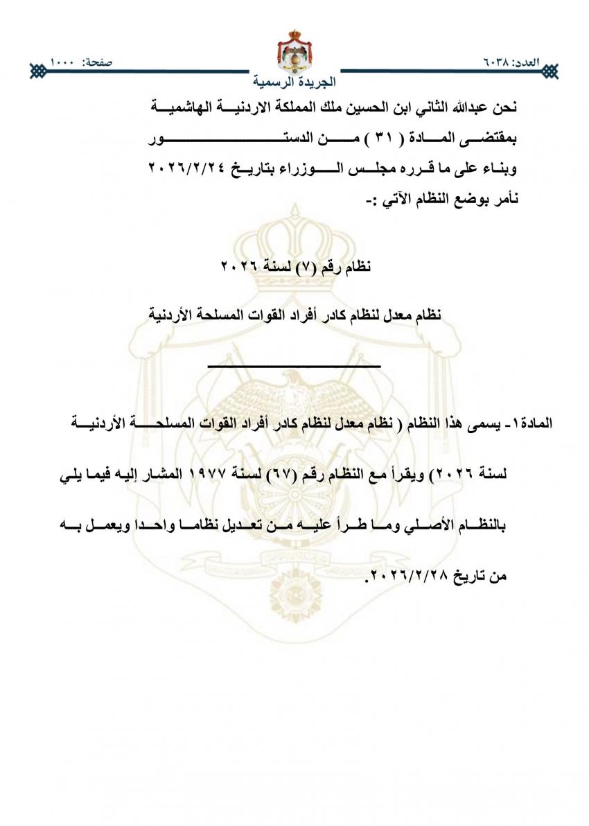 صدر في عدد الجريدة الرسمية اليوم الخميس النظام المعدل لنظام كادر ضباط القوات المسلحة الأردنية، والنظام المعدل لنظام كادر أفراد القوات المسلحة الأردنية.