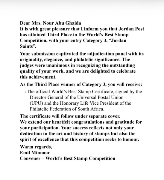 ويعكس هذا الفوز مكانة الأردن المتقدمة في المحافل الدولية، ويؤكد تميز البريد الأردني في تصميم وإنتاج الطوابع ذات القيمة الفنية والثقافية والتاريخية الرفيعة، بما ينسجم مع إرث المملكة الحضاري والديني.