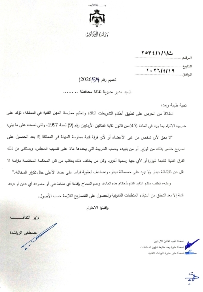 أصدر وزير الثقافة كتابًا رسميًا يؤكد فيه ضرورة الالتزام بتطبيق أحكام التشريعات الناظمة لممارسة المهن الفنية في المملكة، مشددًا على عدم السماح لأي شخص أو جهة بمزاولة النشاط الفني إلا بعد الحصول على التصاريح القانونية اللازمة، وذلك حرصًا على تنظيم القطاع الفني وضبطه وفق الأصول المعتمدة.