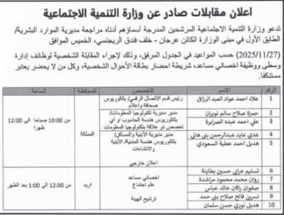 وظائف شاغرة ومدعوون لاجراء المقابلات الشخصية (أسماء) #عاجل